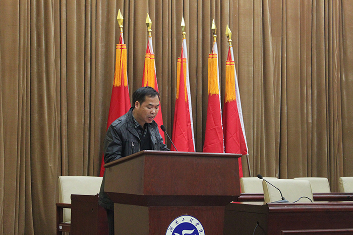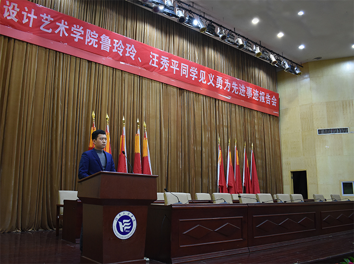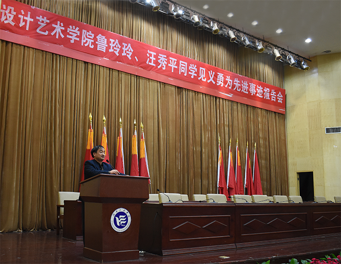 会议开始,主持人张澎向大家讲述了11月2日下午在我校体育馆师生三人救助男青年的见义勇为先进事迹。我院环境设计专业1604班汪秀平、鲁玲玲同学20分钟的紧急救援挽救了一个年轻的生命,在救助过程中承受了巨大压力,事后却未曾向任何人提及救人事件,直到14日被救的青年与其家人、领导来校向师生三人赠送锦旗,见义勇为先进事迹才浮出水面。