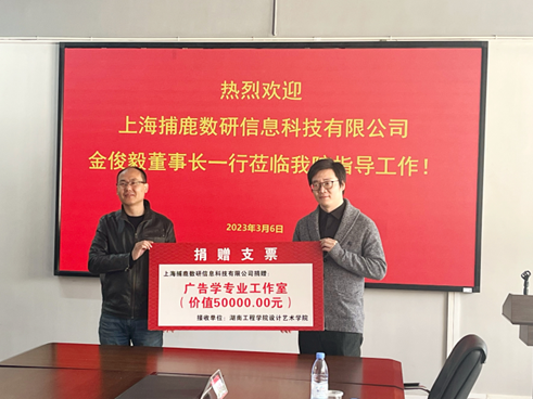 3月6日,上海捕鹿数研信息科技有限公司董事长金俊毅先生一行莅临湖南工程学院365英国上市,出资五万元捐赠广告学工作室,这是继捐赠抖音电商直播工作室以来的第二次捐赠。王兴业院长代表学院接受捐赠并表示由衷感谢。