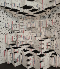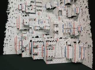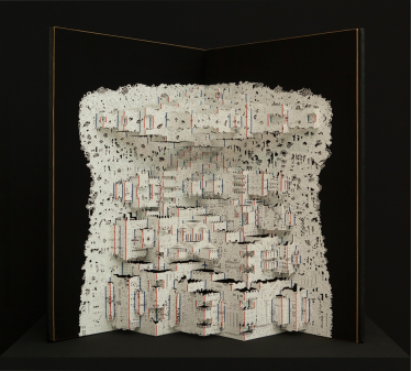 展会现场围满了 “二刷”“三刷”《碳折叠NO.3》的观众,纷纷对作品的构思与技法展开讨论。《碳折叠NO.3》是唐征维老师碳折叠系列作品中的第三件,他尝试将排放的主要基础——工业体组合成一个“排放帝国”,在手法上融合剪纸与立体折纸技法,最后形成书籍的样式。希望通过纸艺术作品的形式阐述对碳金融背后的权力架构的思考。