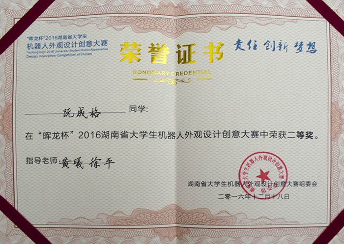 创新推动发展,科技引领未来。12月18日,“晖龙杯”2016湖南省大学生机器人外观设计创意大赛在湖南大学隆重举行。此次大赛由湖南省发明协会、湖南省机器人产业协会共同主办,由湖南晖龙集团股份有限公司承办,并得到了湖南省知识产权局、国家知识产权局专利局长沙代办处的大力支持。“晖龙杯”湖南省首届大学生机器人外观设计创意大赛自九月底开始启动,大赛共收到了来自全省近30所高校的388名大学生的219件作品,省、市领导,专家学者、企业代表等近400人出席了本次大赛。我校365英国上市产品1302班阮成格同学荣获创意大赛二等奖。