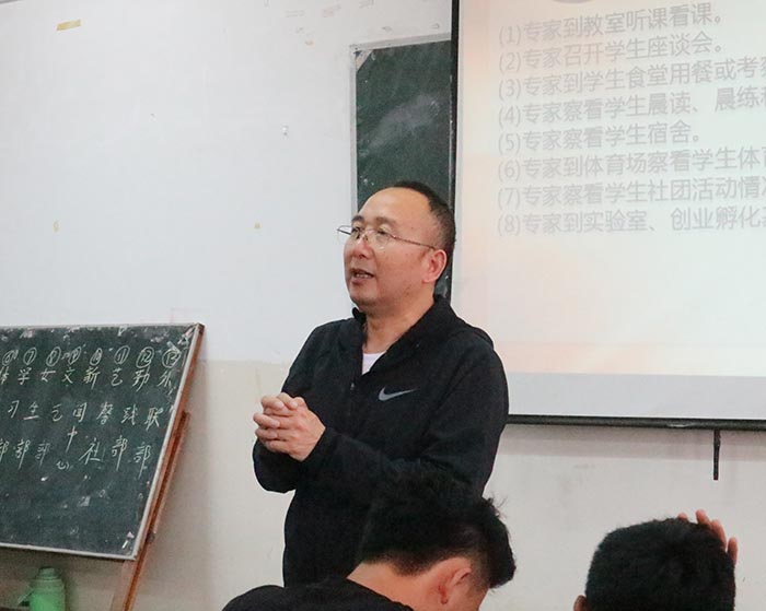 辅导员张超作本科教学工作审核评估培训。张超对本科教学审核评估的意义、目的、内涵、原则、范畴、程序及要求等做了深入而详尽的阐述和解读。在报告中,他介绍了高等教育评估模式、审核模式及审核评估的重要性;着重解析了审核范围以及定位和目标、师资队伍、教学资源、培养过程、学生发展、质量保障等审核项目;阐述了审核评估如何评,审核评估的日程,专家审核什么内容等。他表示,本科教学审核评估是对学校本科人才培养的一次全面检验,希望大家认真领会审核评估的内涵,深入理解审核评估的内容,认真做好评建工作。