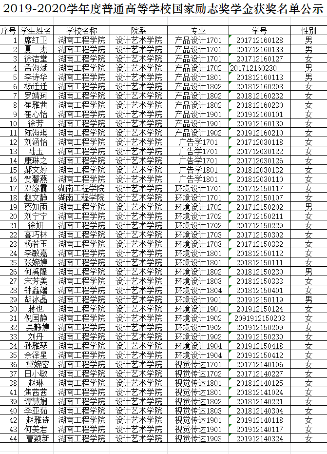 根据学校《校教字[2016]41号 湖南工程学院学生奖学金评定及管理条例》、《校教字[2014]51号 湖南工程学院学生综合素质测评办法(修订)》及《湖南工程学院国家励志奖学金评定及管理条例》(校教字〔2016〕43号)等文件精神和要求,我院认真组织、安排国家励志奖学金的评审工作,制定奖学金评审细则,并要求各班成立以班主任为组长的7人评审小组负责本班学生的奖学金评审工作。我院坚持公开、公平、公正的原则,实行等额评审,经学生工作办公室审核,党政联席会议审定,评选出励志奖学金44人。具体名单附后。公示时间为2020年11月9日到11月13日,公示期五天,如有异议,请与学办联系。