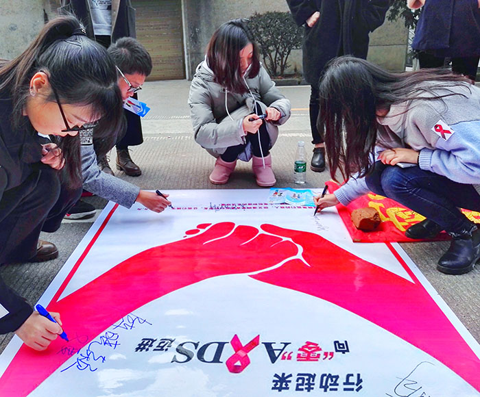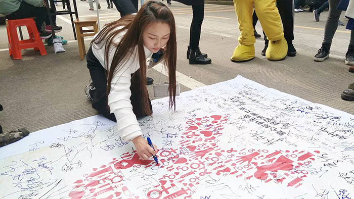 活动中志愿者们向路过的学生发放艾滋病知识手册和爱心防艾贴纸,呼吁过往同学在横幅上签名。随后,以班级为单位的防艾签名活动分别在学海、滨江食堂门口开展,各班级积极发挥创意思维,自制防艾签名纪念品热情宣传,用笑容融化对艾滋病的误解,用拥抱表达人心的温暖,用名字传播一份力量。下午四时,在学海花园举办“为艾开跑”活动,奔跑路线从学海到滨江,志愿者们热情不减,激情满怀,为活动画上了圆满的句号。