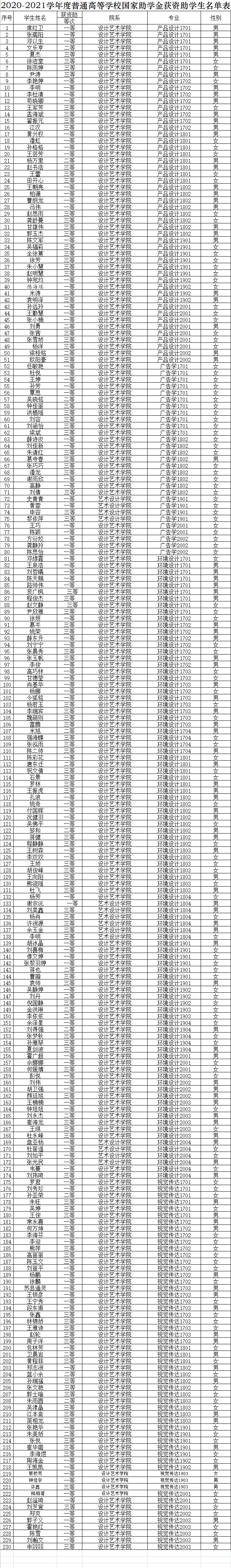 根据学校《湖南工程学院国家助学金奖学金评定及管理条例》等文件精神和要求,我院认真组织、安排国家助学金的评审工作,制定助学金评审细则,并要求各班成立以班主任为组长的7人评审小组负责本班学生的助学金评审工作。我院坚持公开、公平、公正的原则,实行等额评审,经学生工作办公室审核,党政联席会议审定,评选出助学金230人。具体名单附后。公示时间为2020年11月16日到11月20日,公示期五天,如有异议,请与学办联系。